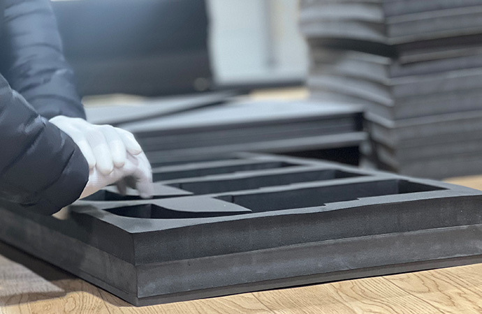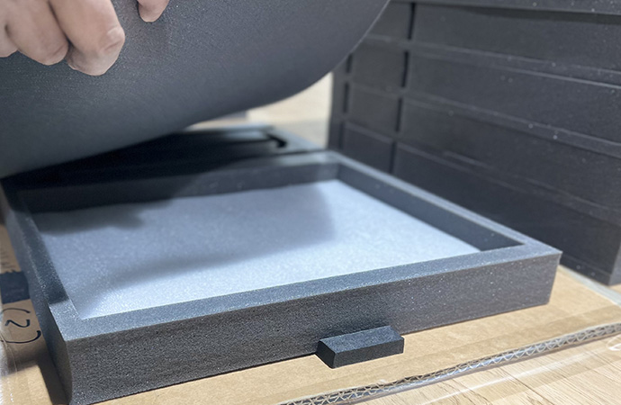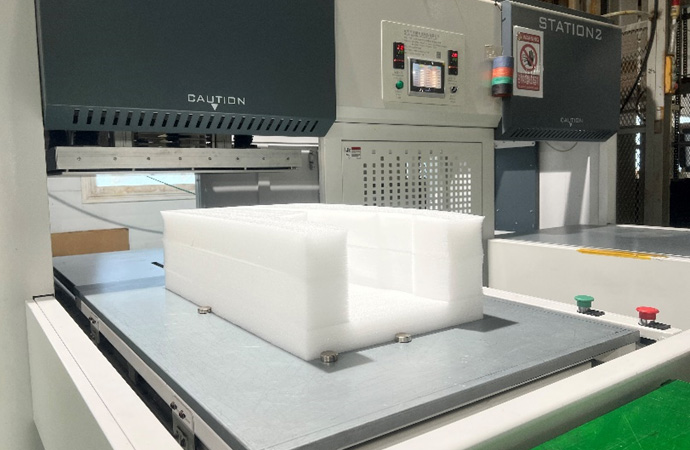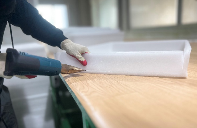 PE FOAM 의 경우는 고열의 DRY머신으로 제품을 순차적으로 성형하고 EVA 또는 BOARD 는 아크릴접착 또는 테이프 접착을 합니다.